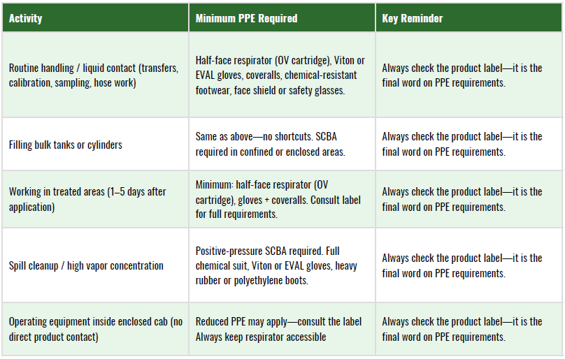 - Full-face + OV cartridge: required for chloropicrin blend products (ex: INLINE™, TELONE™ C-35 by Teleos).