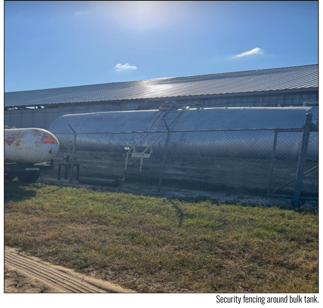 - 6-foot minimum fence enclosing all tanks, containment, and transfer piping.