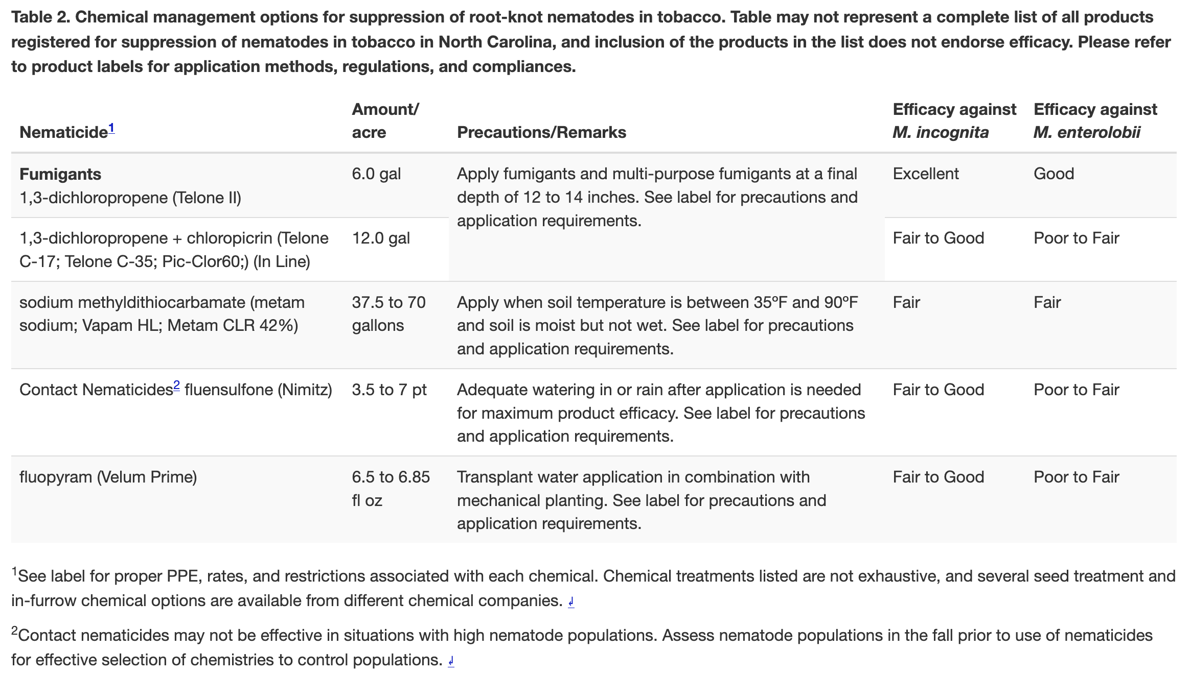 Nematodes are a common pest in tobacco-growing areas. Most tobacco growers also grow sweetpotatoes, and many of the same nematodes affect both crops. Root-knot nematodes are the predominant species, with the guava root-knot nematode (Meloidogyne enterolobii) being particularly destructive. These enterolobii nematodes are larger, more aggressive feeders that can easily overtake a field. They have a shorter (20-23 day) lifecycle compared to most root knot species (28-31 days), and there are currently no tobacco varieties resistant to enterolobii nematodes. Nematodes attack developing plant roots, resulting in damage that manifests itself in many ways throughout the season.